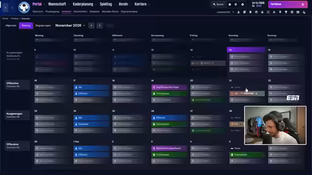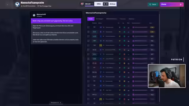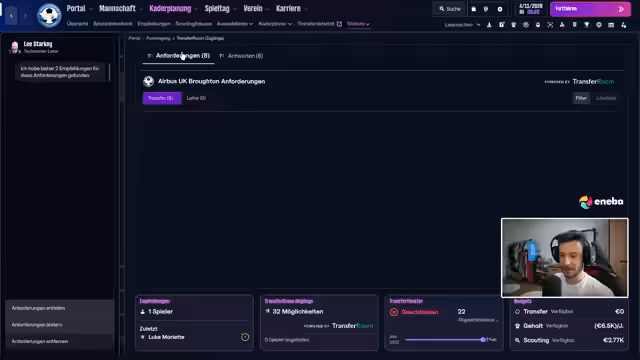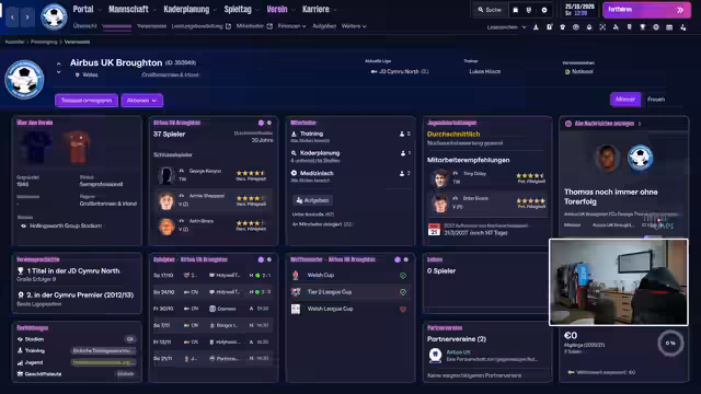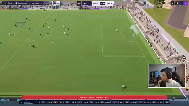 00:24:57Der Fokus liegt auf dem Fußball-Manager-Spiel, speziell auf der Krise des walisischen Teams Airbus UK Broughton. Nachdem verschiedene Taktiksysteme wie 4-3-3 und 4-4-2 erprobt wurden, entscheidet sich der Streamer für eine Rückkehr zum klassischen 4-3-3-System mit Ballbesitz. Das Ziel ist, die Defensive zu festigen und durch mehr Ballkontrolle offensiv gefährlicher zu werden, um der sportlichen Krise zu entkommen.