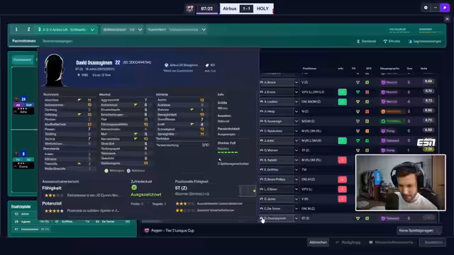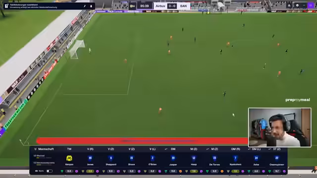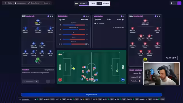 01:22:34Der Stream beginnt mit einer persönlichen Anekdote zum Spiel Football Manager, in der die Dauer der Profistatus-Anträge thematisiert wird. Anschließend wird der Fokus auf das aktuelle Spiel des Airbus UK Broughton F.C. gerichtet, eine Partie gegen Keresus. Der Kommentator erläutert seine Taktik, die mit einem 4-2-3-1-System startet und den zentralen Sechser defensiv orientieren soll, um den Gegner abzuschirmen und das eigene Team zu stabilisieren.