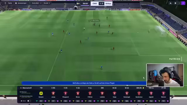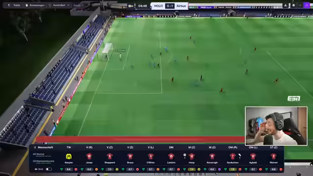 02:36:40Der Streamer beginnt eine neue Partie gegen Holyhead. Trotz des Siegs im letzten Spiel wird die Formation erneut angepasst. Stürmer Warren wird aus der Startelf genommen und Jasper kommt in die Offensive. Der Kommentator möchte die Offensive stärken und mehr Druck erzeugen. Trotz der offensiveren Ausrichtung bleibt der Spielverlauf zunächst ereignislos und von Ballbesitz geprägt.