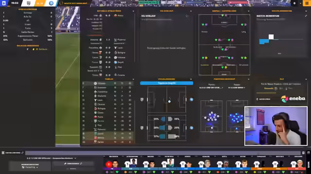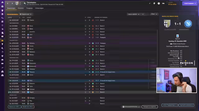 00:45:03Nach den Diskussionen zum FM wechselt der Streamer zum aktuellen Projekt im Spiel. Er berichtet, dass sein Verein Parma Calcio unter einem 'Ultimatum' des Vorstands steht, da die Leistung nicht den Erwartungen entspricht. Das Team steht nach einer 2:3-Niederlage bei Udinese und einem 1:1 gegen Lazio auf dem 15. Tabellenplatz. Mit dem Ziel, im Mittelfeld abzuschließen, müssen in den anstehenden Spielen gegen Napoli, Bologna, Pisa und Cesena dringend Punkte geholt werden, um den Trainerposten zu sichern.