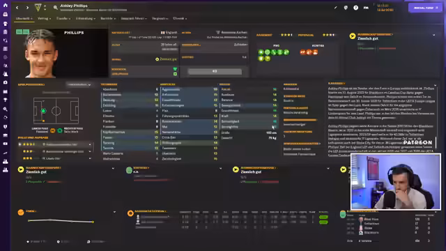 01:36:08Der Streamer steckt mitten in heftigen Transferverhandlungen. Murau erhält Angebote von Dortmund, Inter und Newcastle für ca. 75 Millionen Euro. Wrobell, ein vielversprechender deutscher Spieler, absolviert sein erstes Länderspieltor und wird gelobt. Unzufriedene Spieler wie Raoul müssen aus dem Kader entfernt werden, um die Teammoral zu stabilisieren. Gleichzeitig plant der Streamer die kommende Saison, die mit Testspielen beginnt, und diskutiert die Ambitionen für die Conference League.
