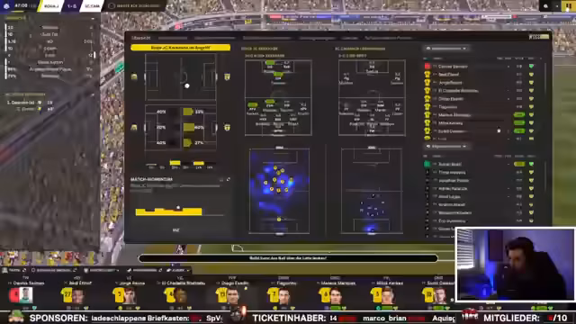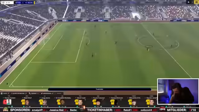 00:32:42Das Highlight des Streams ist das Champions-League-Auswärtsspiel gegen Inter Mailand im San Siro. Nach einer frühen Verletzung von Enriques und unzähligen aluminiumtreffenden Schüssen, geht die Roda Kerkrade mit 0-2 in die Pause. Trotz der Niederlage bleibt die Stimmung positiv, da der Verbleib in der Champions League durch ein eventuelles Unentschieden oder sogar eine Niederlage gesichert ist.