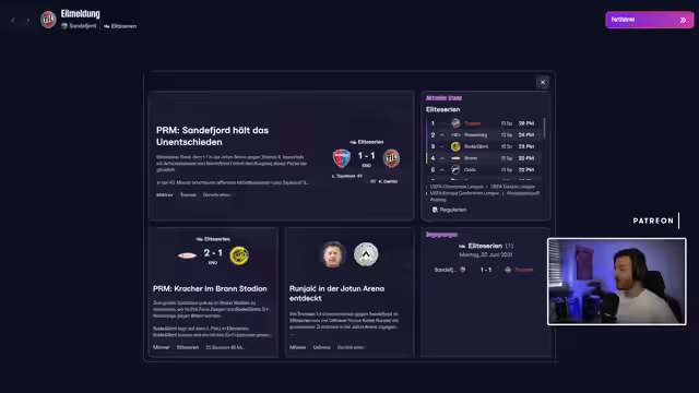 00:20:29Nach der Ankündigung des möglichen Saisonendes schaut sich der Streamer die aktuelle Saison im Football Manager 26 an. Die Saison läuft bisher nahezu gigantisch. Der Verein ist Tabellenführer mit fünf Punkten Vorsprung auf Budde und sieben Punkten auf Rosenborg. Trotz eines geisteskranken Starts mit hohen Siegen wurde der Titelkampf insgeheim stabilisiert. In der Champions League ist der Verein direkt qualifiziert, was für eine erfolgreiche Saison spricht.