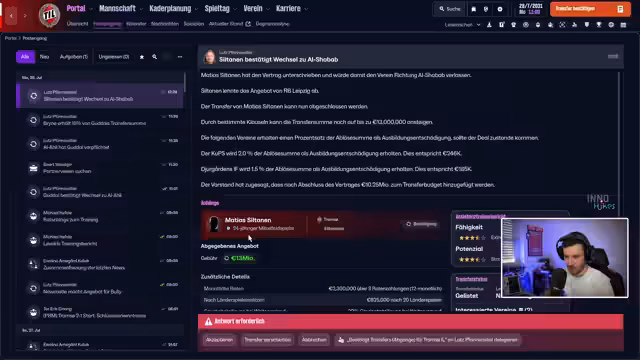 00:32:41Der Streamer wechselt in die Transferszene und stößt auf eine abgefahene Transfergeschichte um den Spieler Kennedy Okpala, vom SV Waldhof Mannheim zum SC Paderborn. Okpala hatte Top-Anwälte, die nach Problemen mit der Ausstiegsklausel eine fristlose Kündigung erreichten, was dazu führte, dass er ablösefrei wechselte und Mannheim sich praktisch selbst ins Knie schoss. Dieser Fall sorgte für große Verwirrung und Aufregung im Chat und beim Streamer.