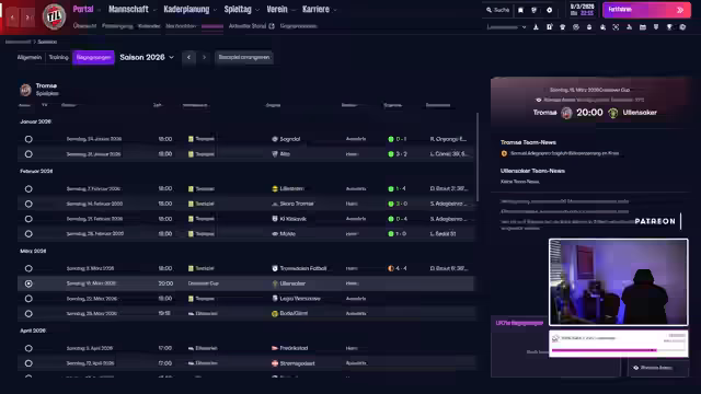 03:23:15Der Stream beginnt mit einem Testspiel gegen Legia Warschau, das als Härtetest gilt. Der Streamer erwähnt ein verpasstes Gegentor, das auf einer falschen roten Kartenanzeige basierte. Im Laufe des Spiels führt Tromsø durch Tore von Troy Nyhammer und Samuel Atikbenro mit 2-1. Kamuish erhöht auf 3-1, woraufhin ein achtfacher Wechsel vorgenommen wird, darunter Ed Watson und Dalsgard. Der Streamer zeigt sich mit dem Ergebnis und der gezeigten Leistung sehr zufrieden.