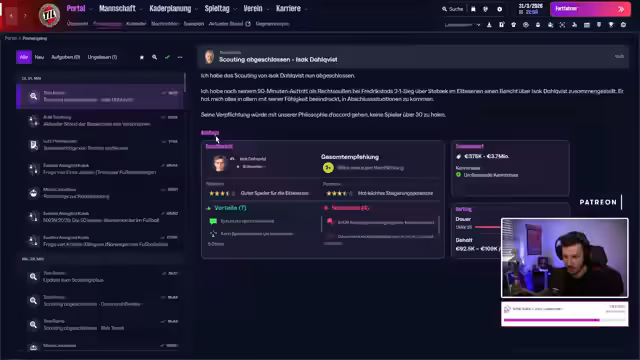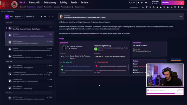 00:17:30Nach einem privaten Update zum Friseurbesuch geht der Streamer zur Sache: Tromsø IL hat durch den Verkauf von Jertödal an PSG 7 bis 8 Millionen Euro eingenommen. Diese Summe steht nun zur Verfügung, um den Kader aufzubauen. Der Streamer stellt die Rahmenbedingungen des Transfers dar, inklusive einer Leihliste und einer Weiterverkaufsklausel. Gleichzeitig wird erwähnt, dass kurz danach ein Angebot von Inter kam, welches angenommen wurde. Der aktuelle Kader wird als sehr stark und zufriedenstellend bewertet, es sind jedoch noch mehrere Positionen zu besetzen, darunter ein Torwarttalent, ein Innenverteidiger und ein tiefer Spielmacher.