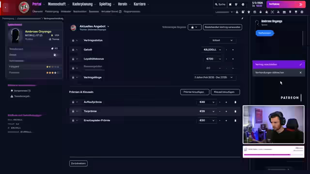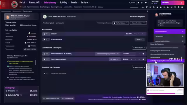 00:33:48Ein zentrales Thema ist die strikte Gehaltsstrategie des Vereins. Der Topverdiener liegt bei knapp unter 100.000 Euro pro Jahr und soll dieser Wert nicht überschritten werden, um die Finanzen stabil zu halten. Dies schränkt die Suche nach neuen Spielern, insbesondere aus höheren Ligen, stark ein. Der Streamer führt die Suche nach talentierten und finanzierbaren Spielern fort und prüft mehrere Vorschläge aus dem Chat. Es wird betont, dass das Budget von 5,5 Millionen Euro noch vorhanden ist, aber sinnvoll investiert werden muss.