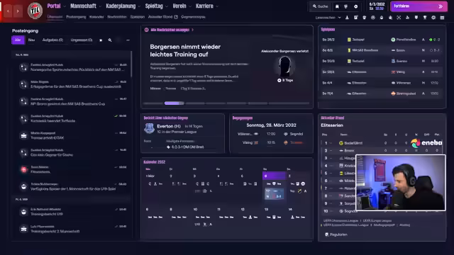 01:53:29Der Streamer teilt Ergebnisse aus verschiedenen Football-Manager-Simulationen mit. Dazu gehören Updates über Tromsø, das in der norwegischen Liga führt, aber in einer kleinen Krise steckt. Er diskutiert auch Europapokal-Ergebnisse, wie Spiele in der Champions League gegen Manchester City und Liverpool, sowie in der Europa League gegen Eintracht Frankfurt. Spielerleistungen, Transfers und Tabellenstände in mehreren Ligen, darunter Bundesliga, La Liga und Serie A, werden thematisiert. Real-life-Fußballereignisse wie Trainerwechsel und Vertragsverhandlungen fließen in die Simulationen ein, was für zusätzliche Dynamik sorgt.