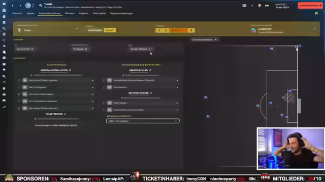 01:14:26Die Vorbereitung der Startelf für Kiel geht in die finale Runde. Die letzten Entscheidungen über die Besetzung der Innenverteidigung werden getroffen, wobei Sander und Johansson favorisiert werden. Spieler, die nicht in das Spielsystem passen, erhalten symbolisch ein 'gelbes Böppelchen', um die Übersicht zu behalten. Neben der sportlichen Vorbereitung teilt der Streamer persönliche Anekdoten mit. Er berichtet über seine sportliche Verletzung, eine Sehnenscheidenentzündung, und über die geplante Bachelorarbeit seines Praktikanten Kai. Die Session endet mit einer humorvollen Frage an den Chat zur richtigen Lagerung von Zucchini im Kühlschrank.