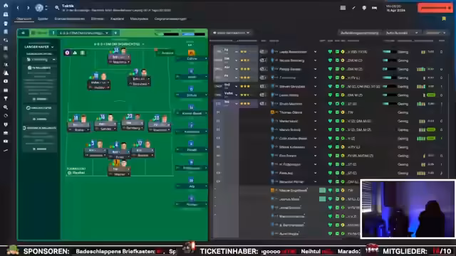 01:31:19Es wird überlegt, ob ein 4-4-2 mit enger Raute und tiefer 6 eine Option wäre. Die Taktik mit dem kompromisslosen Verteidiger wird weiter verfolgt, obwohl der Streamer selbst überrascht ist, so etwas zu machen. Isevic wird als mögliche Option für den Abräumer in Betracht gezogen. Der FCN hat noch nicht geantwortet, was für Unmut sorgt. Finn Porath soll eher offensiv eingesetzt werden, möglicherweise als vorgeschobener Spielmacher. Es wird betont, dass Siege benötigt werden, und dass der aktuelle Kader verwendet wird. Friedhjonsson wird als Zielspieler und der Fitte Orb als Schattenstürmer eingeplant. Es wird erwähnt, dass FM24 gerade im Angebot ist. Es wird überlegt, ob die Spieler auf außen spielen und flanken sollen, da dort große Spieler vorhanden sind. Es wird diskutiert, ob hartes Tackling angewendet werden soll. Es wird eine Taktik gespielt, die der Streamer noch nie zuvor gespielt hat. Es wird nach Empfehlungen für Standards gefragt und betont, dass die Bälle in den Strafraum fliegen müssen. Es werden verschiedene Standardvarianten geladen und gespeichert. Es wird ein Fokus auf Spielanalyse und Teamgeist gelegt. Das Saisonziel ist der Klassenerhalt. Es wird überlegt, wie der Fokus im Training gesetzt werden soll, da nur noch zwei Trainingstage zur Verfügung stehen. Es wird ein Kapitän gewählt und betont, dass es sich um eine Tageschallenge handelt. Es wird versucht, die Stimmung im Team hochzuhalten.