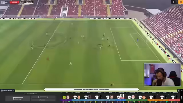 01:47:28Die zweite Live-Simulation beginnt gegen den VfL Wolfsburg, der als Tabellenletzter ebenfalls einen Sieg benötigt. Alemannia Aachen gerät früh in Rückstand und zeigt eine schwache Leistung, was der Streamer als „Trainer-Effekt“ bezeichnet. Trotz personeller Änderungen wie der Einwechslung von Isekor und Ullmann gelingt es der Mannschaft nicht, das Blatt zu wenden und verliert auch dieses Spiel.