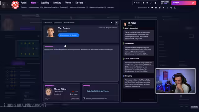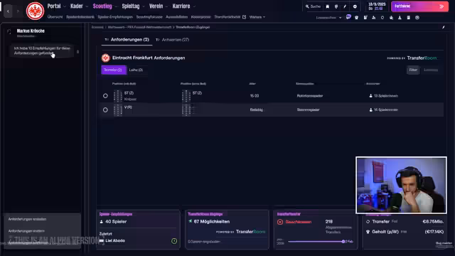 00:27:00Nach einer Unterhaltung mit dem Chat über den Startverein und die Beschränkungen des Streams entscheidet sich der Streamer für Eintracht Frankfurt. Er begründet dies damit, dass Frankfurt ein Champions-League-Teilnehmer ist und der Spieler Can Yilmaz Usun im Kader ist. Nachdem er den Verein ausgewählt hat, navigiert er durch das Menü und zeigt den anfänglichen Kader. Er beginnt dann mit seinem ersten Transfer, indem er ein Angebot für Florian Neuhaus von Borussia Mönchengladbach abgibt und die Verhandlungen erfolgreich abschließt.