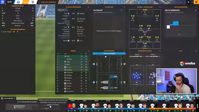 01:20:39Zu Beginn des Streams wird das aktuelle Spiel gegen Cagliari analysiert. Nach einem 2-0-Sieg gegen Lazio und einem 0-0 gegen Torino liegt Parma nun mit 0-1 zurück. Der Streamer kritisiert die mangelnde Konstanz der Mannschaft und hofft auf einen Ausgleich. Er äußert sich über die Leistung von Dresoldi als inverser Außenstürmer und fordert diesen auf, jetzt zu liefern. Das Matchmomentum, so ein Influencer, könnte eine Krise auch geil machen.