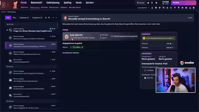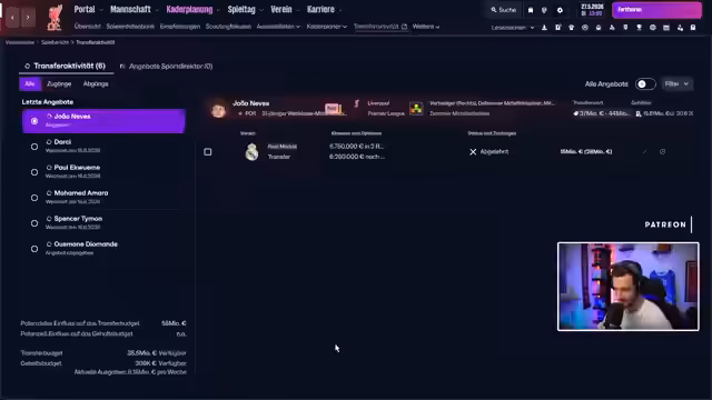 01:21:09Der Stream konzentrierte sich auf die Transferplanung für den FC Liverpool. Es wurden gezielte Spieler für die Positionen im defensive Mittelfeld und in der Abwehr gesucht. Potulski wurde als möglicher Innenverteidiger-Backup ins Auge gefasst, mit besonderem Fokus auf seine athletischen Eigenschaften und seine mentale Verfassung. Gleichzeitig suchte man nach einem Stammspieler auf dieser Position, um das Team zu verstärken.