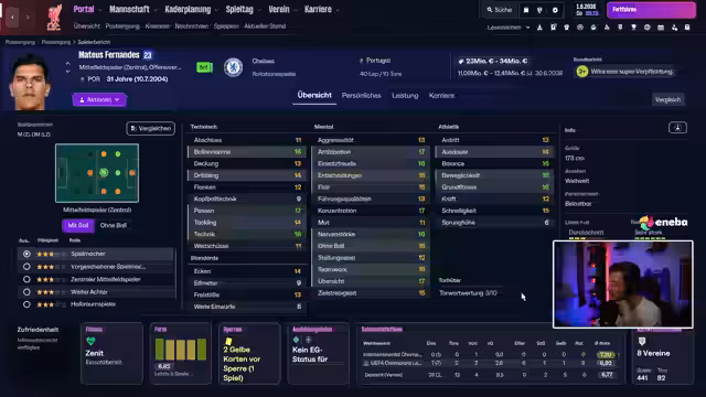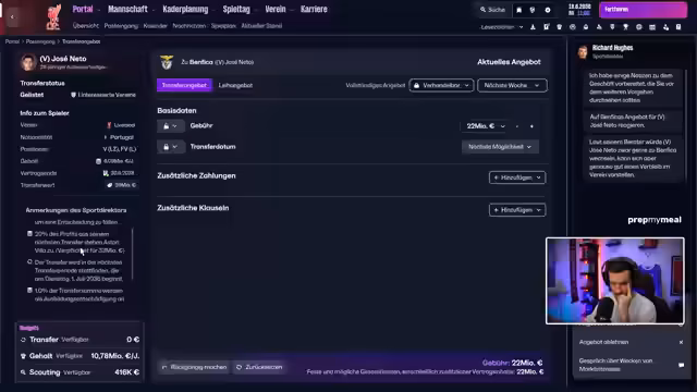 01:16:20Der Streamer tauscht sich über Transferverhandlungen und strategische Entscheidungen im Kader auf. Er diskutiert über Spieler wie Matthias Fernandes, für die es Angebote gibt, und die Entscheidung, ob dieser geholt werden soll oder nicht. Dabei analysiert er die Attraktivität des Spielers, die Transferkosten und dessen mögliche Rolle im Team. Der Streamer berücksichtigt auch Alternativen und die finanziellen Auswirkungen von Transfers. Er zeigt sich vorsichtig bei der Bewertung älterer Spieler, um mögliche Verletzungen oder Leistungsabfall zu vermeiden, und betont die Notwendigkeit einer ausgewogenen Mannschaft.