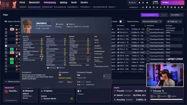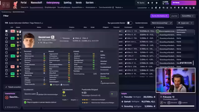 00:37:20Der Streamer fokussiert sich auf die Transferaktivitäten für die kommende Saison, wobei er den Fokus auf die Innenverteidigerposition legt. Er diskutiert über potenzielle Transferziele und die finanziellen Rahmenbedingungen. Es werden auch Scouting-Aktivitäten vorgestellt, wobei sowohl junge Talente als auch erfahrene Spieler im Fokus stehen. Der Streamer erwähnt auch die Vertragsituation einiger Spieler und erwägt, einige zu verkaufen, um Budget für Neuzugänge freizumachen. Dabei geht er auch auf die Eigenschaften und Anforderungen bestimmter Positionen ein und wie diese mit den verfügbaren Spielertypen übereinstimmen oder nicht.