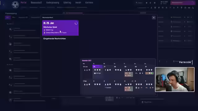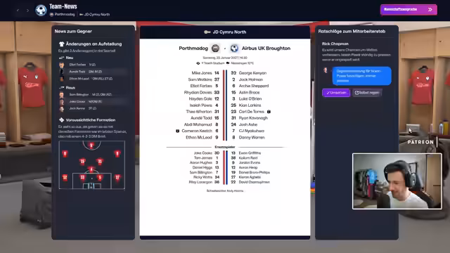 00:23:59Nach einigen persönlichen und technischen Themen sowie Diskussionen über FM 26 wechselt der Streamer zum aktuellen Spiel. Es ist das Viertelfinale des Welsh Cup, in dem sein Team, Airbus UK Broughton F.C., gegen den Tabellenfünften der ersten walisischen Liga, Landutno, antritt. Der Streamer sieht sich als deutlichen Underdog und plant, ein kompakt-defensives 4-2-3-1-System zu spielen. Martin im Chat startet eine spontane Wette, wie schnell ein Tor fallen wird, was den Streamer antreibt.