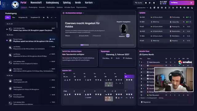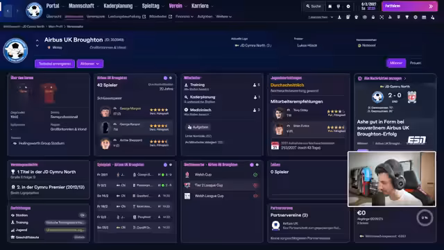 00:40:24Airbus UK Broughton F.C. gewinnt das Pokalspiel absolut verdient mit 2:0 und ohne ein einziges Gegentor kassiert zu haben. Das Team bleibt damit im Wettbewerb und trifft im Viertelfinale auf Colwyn Bay. Nach dem Spiel geht der Streamer auf Themen wie die Liga, den verbleibenden Vertrag, die anstehende Trainerprüfung und Transferüberlegungen ein. Er erwähnt auch seine aktuelle persönliche Situation, dass er sich wegen des Umzugs seiner besseren Hälfte in Magdeburg befindet und dort streamt.