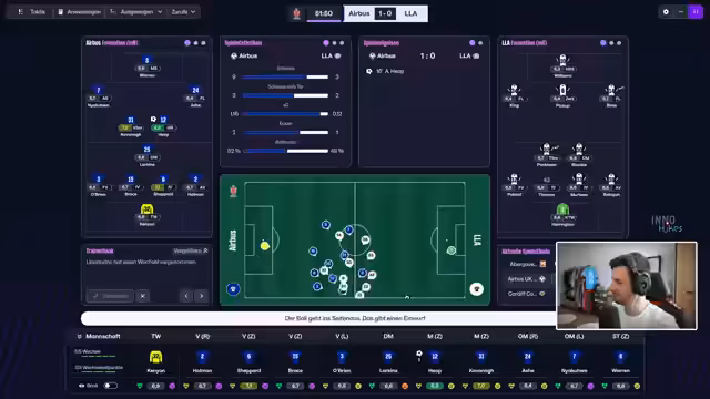 02:04:47Aufgrund der mangelhaften Offensivleistung wird die Aufstellung verändert. Ossamuimin kommt zurück, De Tordes wird zum tiefen Spielmacher und Kavanek zum Box-to-Box-Spieler. Der Streamer erwähnt den eigenen Genesungsprozess und plant ein gesundes Mittagessen. Trotz der taktischen Umstellung bleibt der Ballbesitz gering, aber das Team hält das Ergebnis und erzielt einen knappen 1-0-Sieg.