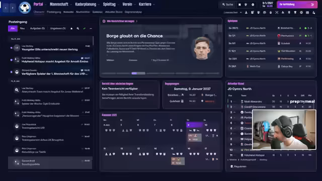 02:36:34Es gibt Neuigkeiten vom Verein: der Vorstand hat die Saisonziele angepasst, eine Partnerschaft mit Chester wurde angekündigt und die U19 gewinnt wieder. Der Streamer bittet den neuen Vorstand um einen Mutterverein. Es gibt ein nostalgisches Video-Schmökern über sein altes Setup als YouTuber, mit BVB-Trikot, Monster Energy und einer Legria-Kamera. Der Stream endet mit einem realistischen Fußballmanager-LP, beginnend mit Nürnberg.