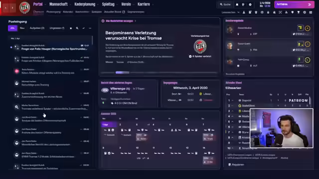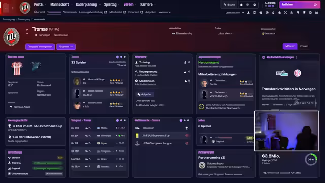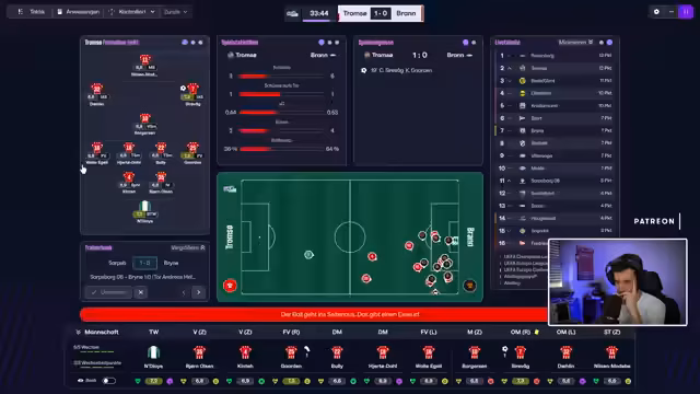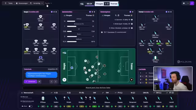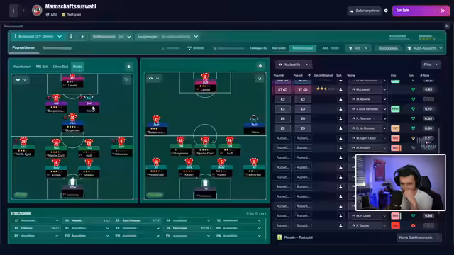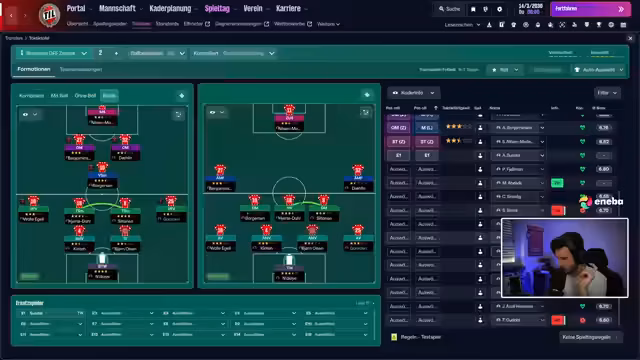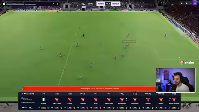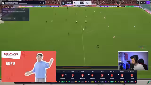 04:10:20Vor dem Spiel gegen Sogndal wird die Aufstellung besprochen. Der Streamer wechselt zwischen offensiven und kontrollierten Taktiken. Spieler wie Borgesen, Bulli und Holzen werden erwähnt. Nach einer Führung durch Borgesen und Bulli wird ein Ausgleichstor durch Tommy Leine kritisiert. Es folgt eine Diskussion über Millionen-Investitionen in die Defensive, insbesondere Innenverteidigung und Torwartposition. Der Verkauf von Florian Moin und Kinti nach Saudi-Arabien wird als finanziell notwendig beschrieben.
