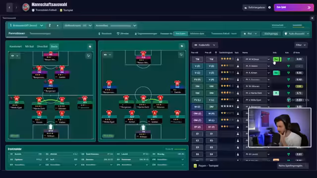 03:00:32Der Streamer plant ein oder zwei weitere Spiele, bevor er sich um Sommertransfers kümmert. Ein Witz über einen 16-jährigen Spieler und mögliche Stream-Termine (oben/ohne) werden angeregt, wobei die Twitch-Richtlinien beachtet werden müssen. Das anstehende Auswärtsspiel gegen Haugesund wird als Herausforderung beschrieben. Dabei werden Gegenspieler wie Säter (Ex-Spieler) und Lewandowski (Linksverteidiger) erwähnt. Die Taktik für das Spiel wird diskutiert, mit Fokus auf offensiven Ansätzen und dem Einsatz von Spielern wie Sirewak, Borgesen und Djal.