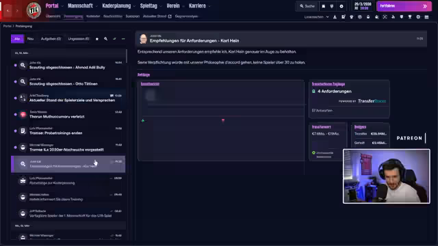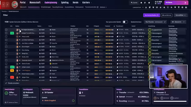 00:57:03Der Streamer analysiert Transfermöglichkeiten und finanzielle Rahmenbedingungen. Er erwähnt den Verkauf von Mahmur Njai für 19 Millionen Euro mit 20% Weiterverkaufsprozent und betont die Herausforderung, einen adäquaten Nachfolger für diesen Preis zu finden. Scouting-Fokus liegt auf jungen, sofort einsetzbaren Spielern, wobei er realistische Gehaltsstrukturen (max. 200.000 Einheiten) und nordeuropäische Herkunftspräferenzen thematisiert. Aktuelle Verhandlungen um einen teuren Spieler von Red Bull Salzburg werden als schwierig beschrieben.