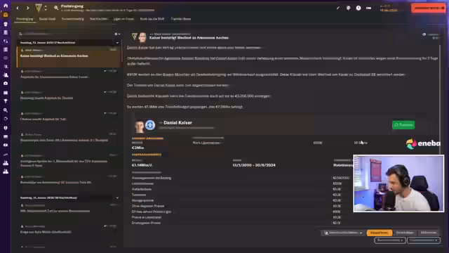 00:33:42Ein bemerkenswerter Transfererfolg wird mit einem 91-Millionen-Deal für einen Spieler bekannt gegeben, der zwei Jahre zuvor ablösefrei geholt wurde. Gleichzeitig wird die Verpflichtung von Nielsen Nkunku als Linksverteidiger-Fix für ca. 5,7 Millionen Euro bekannt gegeben. Ein weiterer Deal für Daniel Kaiser wird ebenfalls abgeschlossen. Trotz der positiven Transfers gibt es Verletzungssorgen, da der neu verpflichtete Nkunku kurz nach der Unterschrift bei der Nationalmannschaft einen Muskelbündelriss erlitt und für drei Monate ausfällt.