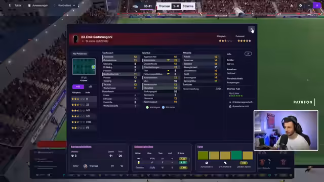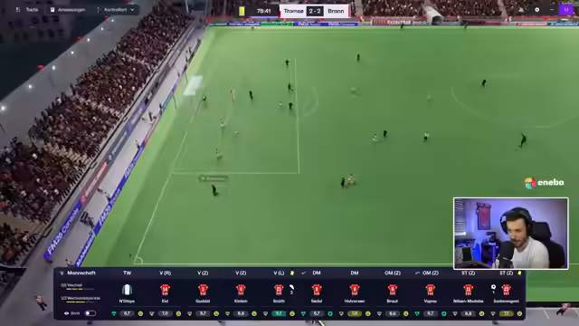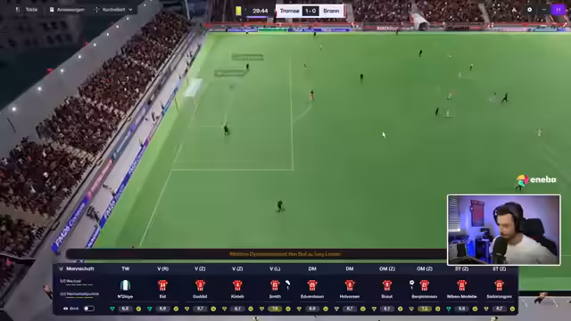 00:29:40Das Team tritt im Braathe-Cup gegen Kristiansund an, den Tabellenführer der zweiten Liga, der nächste Saison in der ersten Liga erwartet wird. Der Streamer erwartet einen Sieg in diesem wichtigen Pokalspiel. Während des Spiels wird ein neuer Torhüter aus dem Senegal vorgestellt, der für viel Geld geholt wurde und großes Potenzial besitzt. Das Spiel verläuft gut, mit viel Ballbesitz und Chancen, die schließlich zum 1:0 durch einen Freistoß von Modebe führen. Kurz vor der Halbzeit ereilt das Team jedoch ein Rückschlag: Modebe verletzt sich, was zu einem Doppelwechsel und taktischen Umstellungen führt. Trotz der Verletzung bleibt die Mannschaft konzentriert und erzielt durch einen Elfmeter von Braut das 2:0. Die Leistung des Teams ist beeindruckend, da es seit längerer Zeit ungeschlagen ist.
