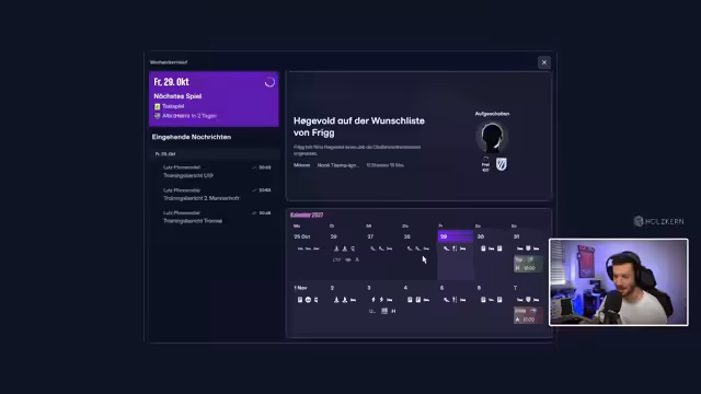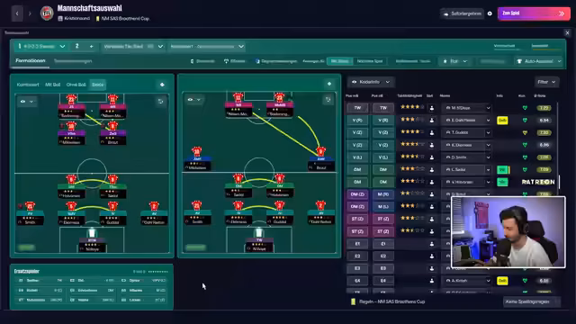 01:46:24Maurice teilt einen Tipp für Spieler, die Probleme mit abgelehnten Vorstandsanfragen bei kleinen Vereinen haben: Vorstellungsgespräche bei anderen Vereinen annehmen, um dort Wünsche zu äußern und so möglicherweise die eigene Position zu stärken. Der Streamer äußert jedoch Skepsis, da er in der Vergangenheit schlechte Erfahrungen damit gemacht hat. Er diskutiert über die richtige Art, Kaffee zu trinken, und verteidigt seine Hafermilch-Zugabe. Im Spielgeschehen wird ein Testspiel gegen Lilleström simuliert, um Spielpraxis zu geben, bevor es in die letzten beiden entscheidenden Ligaspiele geht. Trotz einiger Verletzungen und Länderspielabstellungen kann eine vernünftige Mannschaft aufgestellt werden.