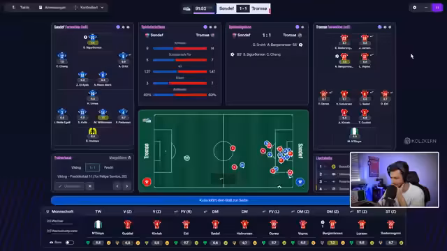 01:20:54Der Streamer bereitet sich auf das drittletzte Saisonspiel gegen Sandefjord vor, das über den Einzug in die Conference League entscheiden könnte. Er trinkt den letzten Schluck Kaffee und hofft auf Effizienz vor dem Tor. Während des Spiels, das zunächst keine Highlights bietet, wird die Community um Ratschläge für einen Zuschauer gebeten, der ein erstes Date hat. Der Streamer und die Zuschauer geben humorvolle und ernste Tipps, darunter den Vorschlag, Taschenwärmer als kleine Aufmerksamkeit mitzubringen. Das Spiel nimmt Fahrt auf, und Aron Benjaminsen erzielt das wichtige Führungstor für das Team, wodurch der Traum von der Champions-League-Qualifikation am Leben bleibt.