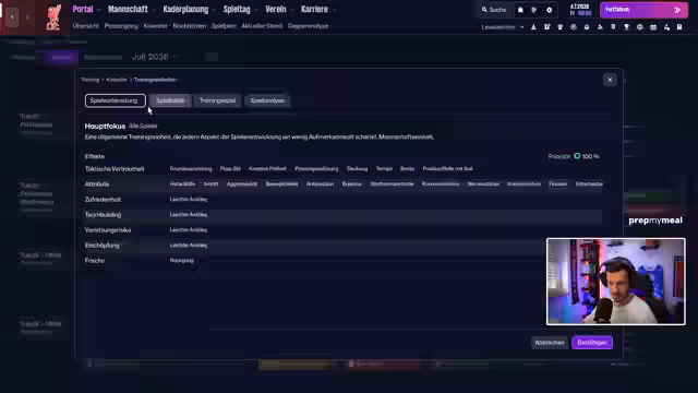 01:38:24Die Planungen schreiten voran, und das System muss greifen. Es wird auf das Training von Spielern gedrängt, besonders auf Fähigkeiten wie Freistöße und Ecken. Es werden verschiedene Spieler für unterschiedliche Positionen in Betracht gezogen, darunter ein Torhüter. Ein Testspiel steht bevor, und der Streamer plant kurze Pausen. Die Zuschauer werden ermutigt, sich ebenfalls einen Kaffee zu holen und für das bevorstehende Spiel zu supportieren.