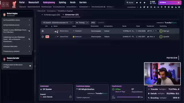 01:18:07Es werden mehrere Talente und Kandidaten für verschiedene Positionen besprochen, darunter Jean-Philippe Pardé und Antonio Arena. Der Streamer zeigt Interesse an diesen Spielern, äußert aber Bedenken bezüglich der Kosten. Es werden auch Spieler wie Jake Traore bewertet. Der Streamer betont die Notwendigkeit, einen ausgewogenen Kader zu haben, der sowohl in der Liga als auch in der Europa-Liga erfolgreich sein kann.