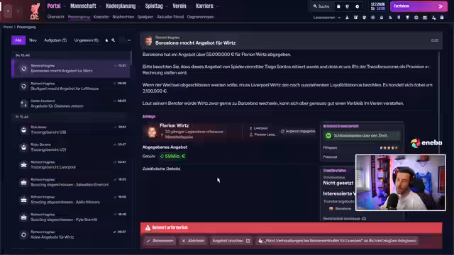 01:51:36Nachdem der Transfer von Florian Würz zu Barcelona abgeschlossen ist, steht der Kader fast fest. Der Streamer äußert sich zur Unzufriedenheit des Kaders mit der Behandlung von Würz und betont, dass dieser dem Verein entwachsen ist. Es werden verschiedene Spieler für unterschiedliche Positionen in Betracht gezogen, und der Streamer spricht über die Notwendigkeit eines Backup-Torhüters. Die Europa-League und die Premier League stehen im Fokus.