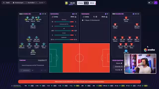 03:30:56Das Spiel gegen Manchester United im Wembley-Stadion beginnt intensiv, mit schnellem Umschaltspiel auf beiden Seiten. Der Streamer ist mit seinem Team unzufrieden und wechselt zur zweiten Halbzeit Celestino für Kadebashvili. Trotz defensiver Probleme erarbeitet sich sein Team Chancen, insbesondere durch Konter über Monga und Lofthaus. Das Spiel endet 1:1 und geht ins Elfmeterschießen, in dem Liverpool nach mehreren verschossenen Elfmetern verliert. Trotz der Niederlage sieht der Streamer positive Aspekte in der Leistung.