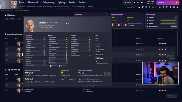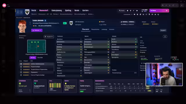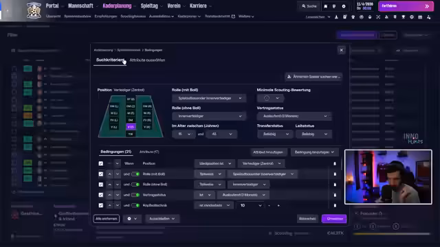 02:43:44Der Streamer berichtet über intensives Scouting. Für die Transferplanung werden vor allem Spieler mit kurzlaufenden Verträgen gezielt beobachtet. Ein Kandidat ist jedoch zu klein für den Tor, was zu einer Diskussion über die notwendige Mindestgröße von 1,86 Meter für Torhüter führt. Es werden Namen genannt und die Strategie erklärt, um eventuell kostengünstig Verstärkung zu holen.