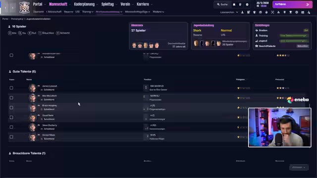 03:09:54Nach dem Unentschieden gegen Celtic richtet der Blick auf das nächste Spiel gegen Hibernian. Es wird ein dynamisches Konter-System anvisiert. Parallel läuft die Kaderplanung für die nächste Saison. Der Streamer sc Spieler in verschiedenen Positionen und stellt Bedingungen wie Vertragsstatus und Attribute. Die Frage nach einer C-Lizenz für Journeyman wird diskutiert.