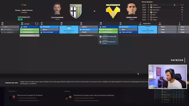 02:33:16Der erste Pflichtspieltag der Coppa Italia gegen Südtirol wird vorbereitet. Nach der Vorbereitung und Transfers ist der Streamer zufrieden mit dem Kader. Im Spiel erzielt Parma ein frühes Tor durch Tresoldi, wobei die Mannschaft dominant agiert. Das Spiel endet knapp gewonnen, und die Vorbereitung ist abgeschlossen. Der Fokus liegt nun auf der Serie A mit dem ersten Auswärtsspiel gegen Milan.