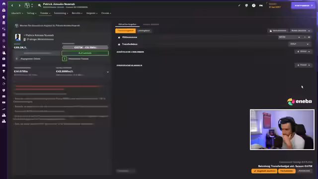02:12:01Der Streamer führt Verhandlungen für den Transfer von Morten Frendrup von Genua für die Zentrale. Er plant die Rücknummer-Registrierung und Torschuss-Einstellungen. Mit einem Leihangebot aus dem Ausland will er einen ausländischen Verein prüfen, priorisiert aber einen dreijährigen Vertrag. Zudem erwägt er einen Transfer von Said Benrama, einem Flügelspieler von Brentford. Der Kader ist fast komplett, es fehlt nur noch ein Backup für den Spielmacher.