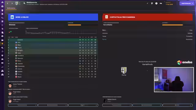 01:28:38Odobert bestätigt seinen Hype mit einer 10,0 im Spiel gegen Udinese und wird zum entscheidenden Faktor. Trotz des Erfolgs häufen sich Verletzungen: Martel (5-8 Wochen Ausfall), Topalovic und Frentrup. Der Streamer rotiert im Pokalviertelfinale gegen Sampdoria (2:0-Sieg), um das Team zu schonen. Der Sieg führt ins Halbfinale, aber die Verletzungsliste wächst. Parma zeigt mentale Stärke mit sieben Punkten aus drei Spielen. Neue Scouts werden evaluiert, während der PC-Bestellstatus (Zahlung ausstehend) und Odoberts Wert diskutiert werden.