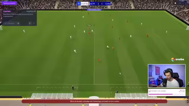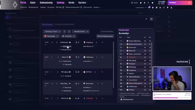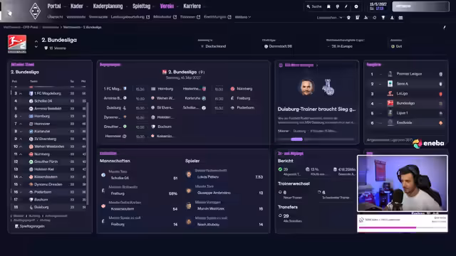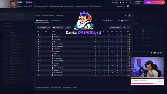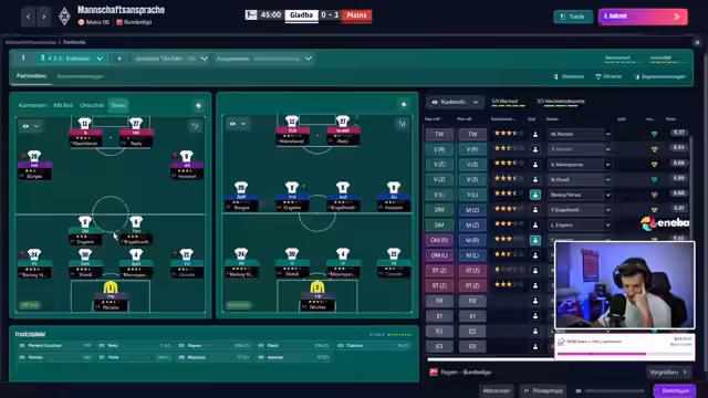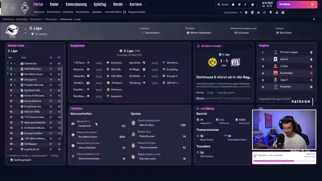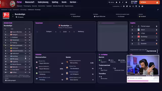 01:51:09Der Streamer hat noch keine Hymne für den neuen Verein vorbereitet und kennt sie auch nicht, was als weiterer Tipp dienen könnte. Es wird scherzhaft erwähnt, dass die Hymne „relativ neu“ sei und einen „italienischen Operneinschlag“ habe. Im laufenden Spiel gegen Mainz wird ein Unentschieden angestrebt, um die Champions League-Qualifikation zu sichern, obwohl die Saison danach nicht mehr lange gespielt wird. Tim Kleindienst äußert den Wunsch, zu einem größeren Verein zu wechseln, was der Streamer akzeptiert, da er ihn nicht halten kann. Es wird bestätigt, dass der Patch zwischen 20 und 21 Uhr deutscher Zeit erscheinen wird. Der letzte Spieltag mit Gladbach steht an, und es wird auf eine Qualifikation für die Europa League über die Liga gehofft. Ein Blick auf die Live-Tabelle zeigt, dass der Streamer auf Rang 5 liegt, punktgleich mit Mainz, aber mit einer schlechteren Tordifferenz, was die Champions League-Qualifikation unwahrscheinlich macht. Die Conference League ist jedoch sicher, und die Europa League ist noch erreichbar. Es wird auch ein detaillierter Blick auf die Abstiegs- und Aufstiegskämpfe in der ersten, zweiten und dritten Bundesliga geworfen, wobei besonders enge Punktstände und spannende Duelle am letzten Spieltag hervorgehoben werden. Der Vorstand ist begeistert von den bisherigen Leistungen, obwohl das Ziel einer oberen Tabellenhälfte in der Bundesliga offiziell als „fehlgeschlagen“ markiert ist, aber gleichzeitig als „abgeschlossen“ angezeigt wird, was auf einen Bug hindeutet.