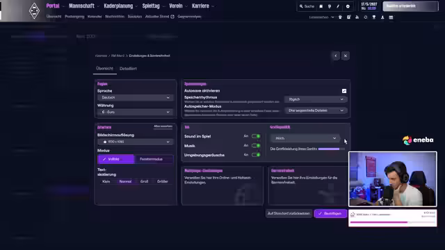 01:19:22Nach dem Sieg gegen Frankfurt beendet der Streamer die Gladbach-Karriere und beginnt mit der Vorbereitung für den neuen Save. Er wechselt einige Spieler ein und testet verschiedene Einstellungen. Der Streamer betont nochmals, dass das Starten des neuen Save an zwei Bedingungen geknüpft ist: das vollständige Abschließen des Gladbach-Saves und der Eintreff des neuen Patches, dessen Ankunft er weiter unsicher im Auge behält.