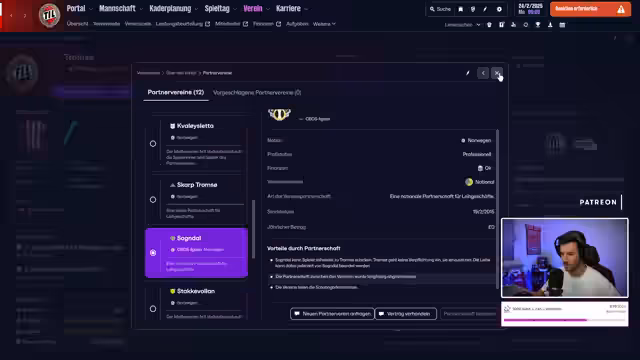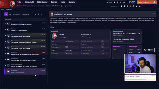 07:02:55Der Streamer geht auf die Vereinsdetails ein, darunter die Rivalen von Tromsø. Bodø/Glimt ist der Erzrivale, bekannt als 'Schlacht um Nordnorwegen'. Weitere Rivalen sind Rosenborg (historisch) und Tromsdalen UIL. Es wird erwähnt, dass Ruben Ittergård Jensen, ein 36-jähriger Spieler, eine Ikone des Vereins ist und über herausragende Führungsqualitäten verfügt. Der Verein verfügt über großartige Trainings- und Jugendeinrichtungen (jeweils 7 von 10). Es wird eine neue Partnerschaft mit Sockendal IL hinzugefügt, einem Verein aus der zweiten Liga, der als einer der südlichsten europäischen Profivereine gilt. Die Partnerschaft soll dauerhaft sein und beinhaltet ein jährliches Testspiel sowie die Möglichkeit des ablösefreien Spieleraustauschs und die Nutzung von Scouting-Kenntnissen. Die Fangemeinde von Tromsø ist geduldig und verständnisvoll, mit einem durchschnittlichen Einfluss auf den Vorstand. Die Erwartungen des Vorstands für die kommende Saison sind eine Platzierung in der oberen Tabellenhälfte der Liga und das Erreichen des Viertelfinals im Crossover-Cup und NM-Cup. Das Transferbudget beträgt 725.000, und das Gehaltsbudget 33.000 Pfund pro Woche. Es wird auch über die Top-Talente Abu Bakar (18 Jahre, aus Gambia) und Dahl (19 Jahre) gesprochen. Der Streamer bemerkt, dass der Verein eine heimliche Liebe zu skandinavischen Ländern und Fußballvereinen hat, inspiriert durch frühere Saves mit Esbjerg und Sockendal.