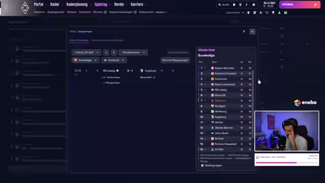 00:21:04Der konkrete Plan für den heutigen Stream ist das zu Ende spielen der Gladbach-Beta-Karriere. Es sind noch fünf Spiele aus der Saison zu bestreiten, darbeiPartien gegen Dortmund, Bayern, Frankfurt, Mainz und Wolfsburg. Nach Abschluss dieses Saves soll direkt mit einem neuen Save gestartet werden, sobald der versprochene FM26-Patch erscheint, was der Streamer für den Abend erwartet.