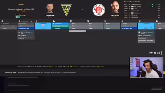 00:43:22Im zentralen Spiel des Tages empfängt der virtuelle FC Aachen den SV Werder Bremen als zweiten Bundesliga-Absteiger. Der Streamer betont, dass sein Team in exzellenter Form ist und nach vier Siegen mit 17:1 Toren als Tabellenführer in die Partie geht. Trotz der Führung ist er unsicher über die taktische Aufstellung im Mittelfeld. Das Spiel verläuft zunächst ausgeglichen, doch seine Mannschaft geht schnell in Führung. Ein Highlight ist der junge Franzose Castelli, der bereits doppelt trifft und das Spiel dominiert. Zur Pause steht es 3:0 für Aachen.