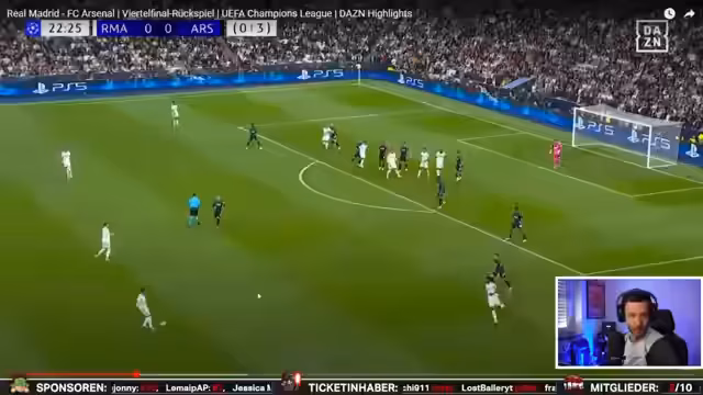 00:23:23Nach einigen technischen Schwierigkeiten beginnt der Streamer damit, Fußballhighlights zu analysieren. Er konzentriert sich zuerst auf das Spiel von Bayern München und wechselt dann zu anderen Champions-League-Spielen. Besonders das Wunder von Real Madrid gegen Arsenal wird intensiv diskutiert, wobei der Streamer die Elfmeterschießentscheidungen kritisiert und persönliche Erfahrungen teilt.