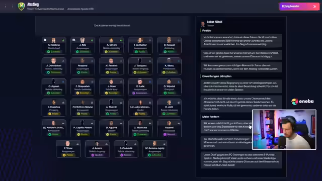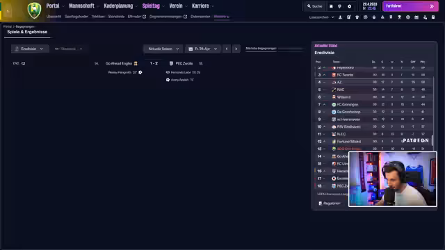 02:39:39Das Team agierte im Spiel gegen Go-Ahead Eagles unkonzentriert und verlor mit 0:1, was die sportliche Talfahrt bestätigt. Die Chancen, den Klassenerhalt noch zu sichern, werden als schwierig eingestuft. Der Streamer signalisiert, dass dies möglicherweise das Ende des aktuellen Save ist, da er sich nach der Saison neuen Herausforderungen zuwenden wird, was die Motivation für den weiteren Verlauf der Saison schwächt.