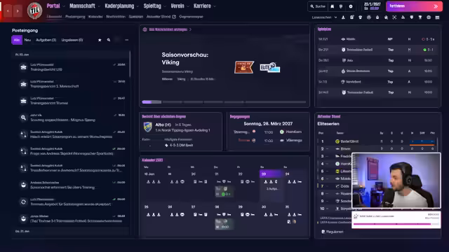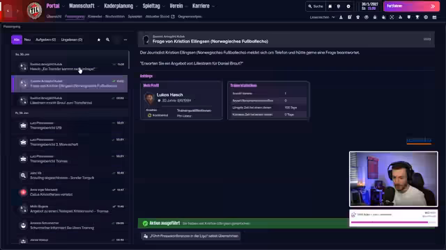 01:21:32Der Streamer entdeckt, dass seine Partnervereine Soggendal und Trümstalen aufgestiegen sind, was ihm die Möglichkeit gibt, zwei seiner Spieler dorthin zu transferieren. Er erwähnt, dass sie bereits 205 Spielstunden im Spiel verbracht haben. Es folgt eine kurze Tipprunde für anstehende Fußballspiele, bevor der Fokus auf die Kaderplanung zurückkehrt. Es steht der Youth Intake am 6. Februar an, und der Streamer muss noch einige Spieler verkaufen. Er akzeptiert Angebote für Spieler, um den Kader zu verkleinern, und zeigt sich erfreut, dass ein Spieler namens Sigurd in die Türkei wechselt. Die Jugendspieler-Kandidaten werden vorgestellt, darunter ein Torwart namens Tjorben Markus, der als Ausnahmetalent gilt, sowie weitere Talente wie Jonathan Marquez und Sondre Valle. Obwohl der Streamer auf mehr Talente gehofft hatte, ist er mit der Auswahl zufrieden und plant, sie in die zweite Mannschaft zu integrieren, falls sie es nicht sofort in die erste schaffen.
