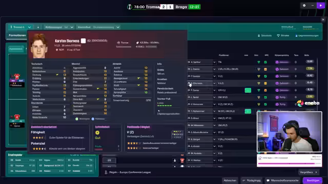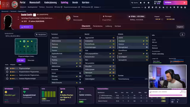 00:18:51Die aktuelle Phase des Streams konzentriert sich auf die Kaderplanung für Tromsø IL im Football Manager 26. Ein wichtiger bevorstehender Termin ist der Youth Intake am 6. Februar 2027, was bedeutet, dass die Aufnahme von Nachwuchsspielern kurz bevorsteht. Der Streamer hat einen „schlauen Zettel“ mit Notizen für die Kaderzusammenstellung dabei und plant, heute noch einige Transfers abzuschließen, um den Kader für die Conference League Zwischenrunde vorzubereiten, deren Auslosung am 2. Februar und die Spiele zwischen dem 11. und 18. Februar stattfinden. Gestern wurde Nikolas Nardai, ein ehemaliger Bundesligaspieler, ein Vertrag angeboten, da noch ein Spielmacher für die Sechserposition gesucht wird. Zudem liegen Angebote für das Top-Talent Abu Bakr Sedi Kinti und den dritten Stürmer Emil Sadarangani vor. Der Streamer überlegt, Sedi Kinti zu verkaufen, um Einnahmen zu generieren und Carsten Ekornes als Innenverteidiger aufzubauen, da Ekornes physisch und mental besser ist und zudem Linksfuß. Er betont den ablösefreien Transfer von Smith aus Ulland als einen der „craziest Deals“ des Projekts, da dieser junge Norweger bereits beeindruckende Attribute aufweist. Die Diskussion über die Schwierigkeit des FM26 kommt auf, wobei der Streamer berichtet, dass er in der ersten Saison mit Gladbach fast abgestiegen wäre, aber den DFB-Pokal gewann, während er in diesem Projekt Fünfter und dann Siebter in der Liga wurde. Er ist sich unsicher, ob das Spiel zu einfach ist, da er von unterschiedlichen Erfahrungen in der Community gehört hat.
