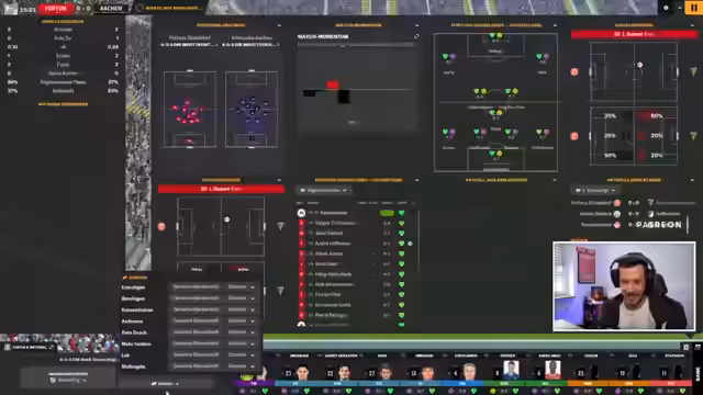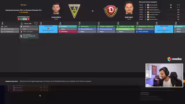 00:38:06Während des Spiels gegen Dresden, das mit einem 5:0-Sieg endet, werden taktische Wechsel vorgenommen. Spieler wie Isekor und Krüger bestechen durch ihre Leistungen. Parallel dazu kümmert sich der Streamer um Scouting und plant neue Trainingsansätze, um die Mannschaft weiterzuentwickeln. Es werden potenzielle neue Trainer und Mitarbeiter für den Verein diskutiert.